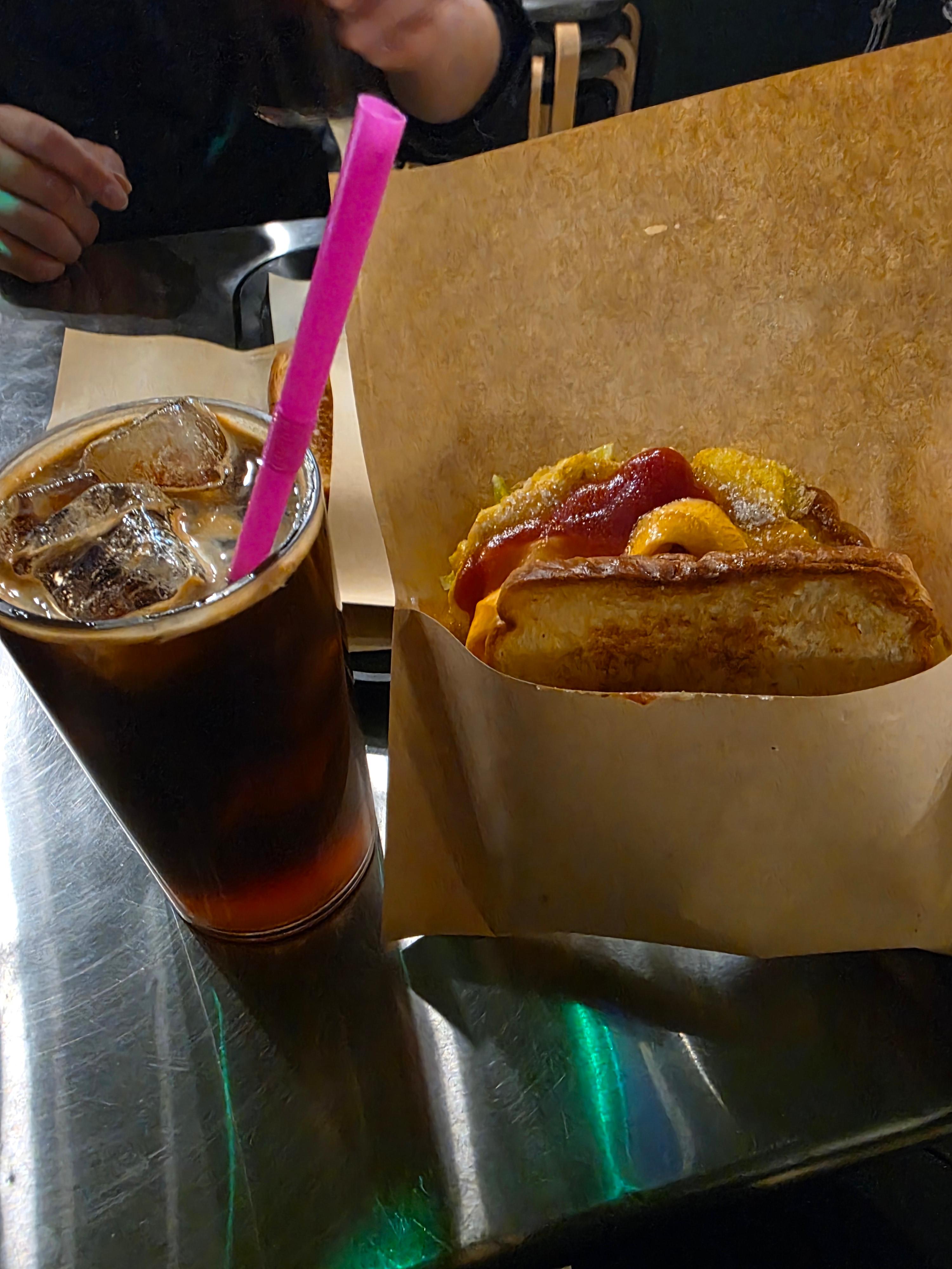 고소하고 짭짤한 맛에 케첩과 설탕이 묘하게 어울린다. 함께 마신 시원한 나의 최애 헤이즐넛 아메리카노도 딱 어울리는 조합.